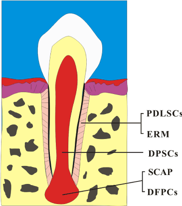 Figure 3. Residual dental stem/progenitor cells around or in the tooth may have the potential to proliferate, recombine and interact in the alveolar fossas after orthodontic extraction leading to the development of tooth. PDLSCs, periodontal ligament stem cells; ERM, epithelial rests of Malassez cells; DPSCs, dental pulp stem cells; SCAP, stem cells from root apical papilla; DFPCs, dental follicle precursor, or progenitor cells.