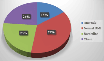 Descriptive statistics show that approximately 42% of the participants were female, about one-third of the participants have tertiary level education, nearly half of them have high blood pressure (Table 1). Although, only two of the respondents representing 5.26% of the participants indicated awareness of being obese as per Table 1, evaluation of BMI showed that nine of them (>23%) have BMI>30 Kg/m2 (Figure 2).