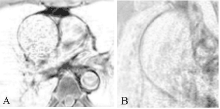 Figure 4. T1-SPIR-BB imaging, axial plane (A) immediately after distal aneurysm edge of ascending aorta; oblique plane (B) before orifice of the brachiocephalic trunk. The intact thickness of the aortic wall (arrows)