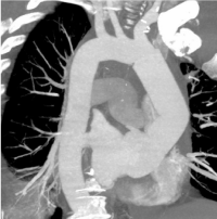 Figure 3. MR-contrast enhancement angiography, arterial phase, breath-hold, oblique plane, 3D reconstruction of the aorta