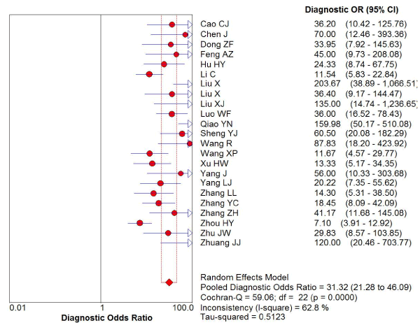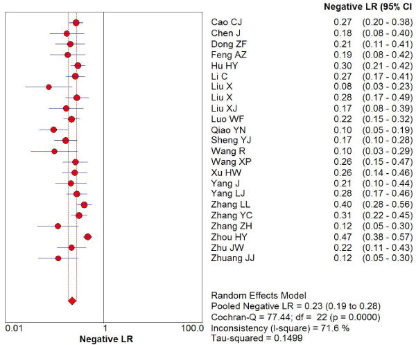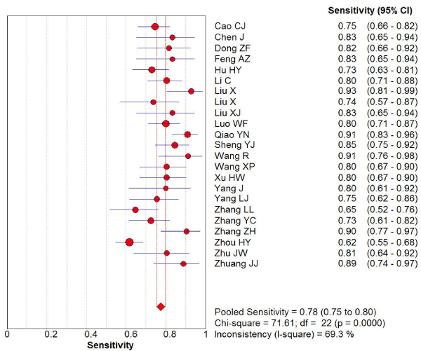 169 studies were identified from the initial search,we excluded 146 studies for the following reasons: reviews or case reports, the publications dealt with other topics, duplication of data, or not available as full text articles. Finally, we identified 23studies represented data from 1478 PD patients for the meta-analysis [1,11,12,21-39]. In 14 articles, PD patients were diagnosed according to the United Kingdom Parkinson’s Disease Society Brain Bank Criteria (UK). In 9 articles, PD patients were diagnosed according to the Movement Disorder and Parkinson’s Disease Group of the Chinese Medical Association Branch of Neurology (Chinese diagnosis criteria) [14]. The main characteristics of all included studies were summarized in Table 1. There was significant statistical heterogeneity among the studies, thus, a random effect model was employed. The pooled sensitivity of TCS for the diagnosis PD was 78% (95% CI: 0.75, 0.80) (Figure 1) and the pooled specificity was 87% (95% CI: 0.85, 0.89) (Figure 2). The pooled LR+,LR- and DOR of TCS were 6.74 (95% CI: 5.04, 8.31) (Figure 3), 0.23 (95% CI: 0.19, 0.28) (Figure 4) and 31.32 (95% CI: 21.28, 46.09) (Figure 5), respectively. The ROC plane did not revealed no heterogeneity secondary to the threshold effect (Figure 6). In addition, the AUC and Q index showed in the symmetric SROC curve was 0.9119 and 0.8442,respectively, which reflected the overall high level of accuracy (Figure 7). The results were consistent when we performed a secondary analysis by repeating the meta-analysis and omitting each study at each iteration. Publication bias may be acceptably low because all the funnel plots on the diagnostic value of TCS in the Chinese PD patients for the included studies did not reveal obvious signs of publication bias (Figure 8).