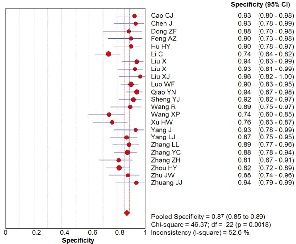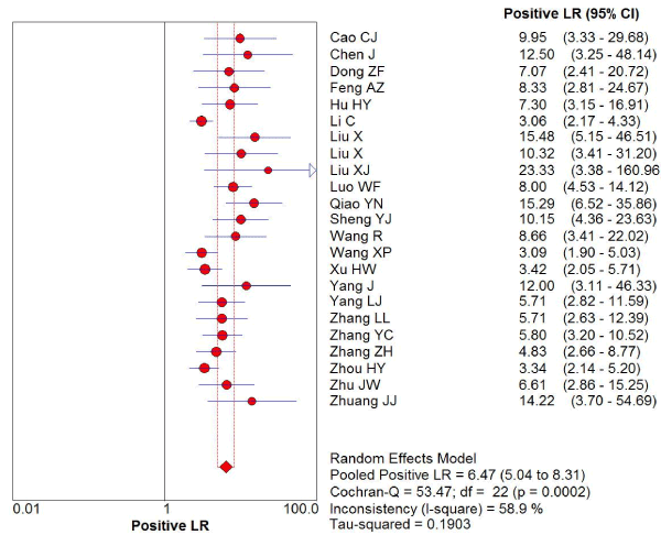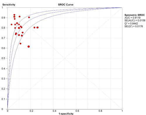 Results: 23 studies with 1478 PD patients were analyzed. The pooled sensitivity, specificity, positive likelihood radio (LR+),negative 1ikellhood ratio (LR-) and diagnostic odds ratio (DOR) of TCS were 0.78 (95% confidence interval (CI): 0.75, 0.80), 0.87 (95% CI: 0.85, 0.89), 6.74 (95% CI: 5.04, 8.31), 0.23 (95% CI: 0.19, 0.28) and 31.32 (95% CI: 21.28, 46.09), respectively, for differentiating PD patients from healthy controls. The AUC and Q index was 0.9119 and 0.8442,respectively. In the subgroup and meta-regression analysis, we found that the important cause of heterogeneity was the sample size of PD patients (P=0.0051).