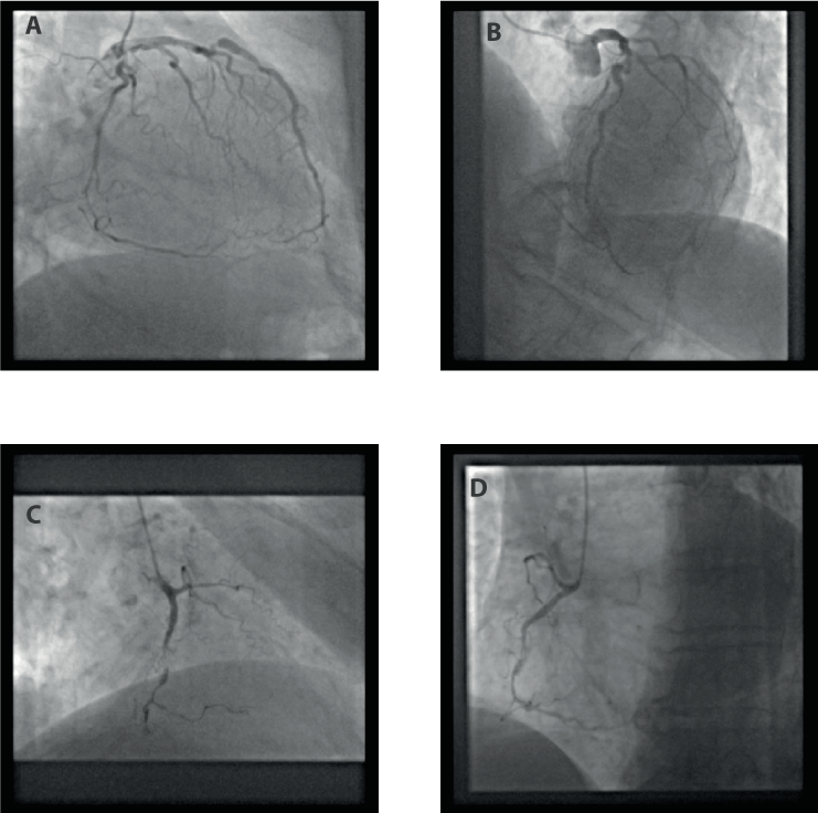 Figure 1. Coronary angiography (16.01.2020). A + B: left coronary artery. Note the retrograde filling of the distal right coronary artery. C + D: right coronary artery.