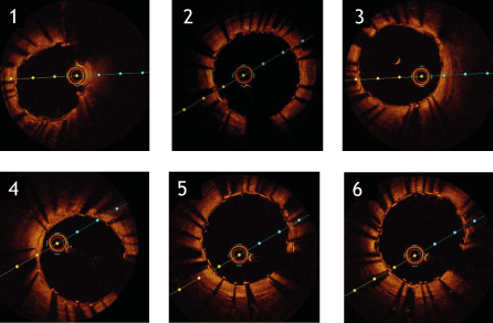 Figure 8. Optical coherence tomography of right coronary artery from distal distal (1) to proximal (6) after additional DES implantation (24.03.2021).