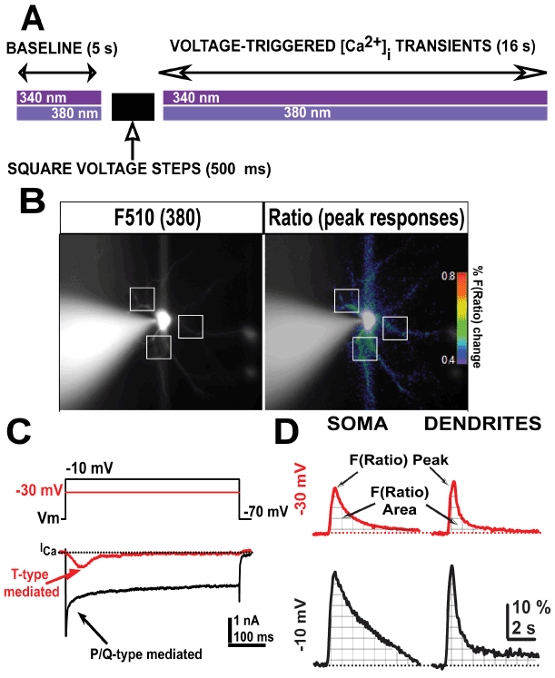 Figure 1. Schematic protocol representation of both ratiometric [Ca2+] fluorescence and voltage-clamp recordings. A, schematic description of the protocol used during consecutive imaging and electrophysiological whole-cell voltage-clamp acquisition. B, representative fluorescence emission from a Bis-fura 2-filled Ventrobasal (VB) neuron excited at 380 nm wavelength (left) and after calculating the fluorescence ratio F(Ratio)=F340/F380 (right) at resting holding potential (-70 mV). Representative dendritic regions of interest are indicated (white squares). The pseudo color bar represents the percentage of Bis-fura 2 mediated F(Ratio) shown in right panel. C, representative T-type calcium currents from a VB neuron elicited by 500 ms long square pulses from holding potential -70 mV to -30 mV (red line) or -10 mV (black line), respectively. D, Representative fluorescent ratio (F(Ratio)) recordings from somatic and dendritic compartments obtained from two different VB neurons. Arrows indicate peak amplitudes and areas (together with grid lines) of F(Ratio) fluorescence signals acquired after -30 and -10 mV holding potential 500 ms pulses in VB neurons.