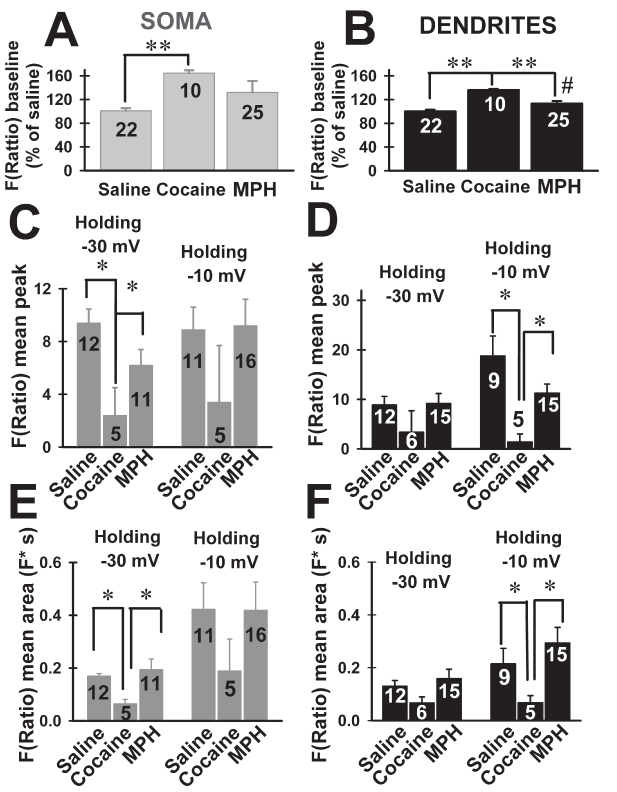 Figure 2. Effects of cocaine and methylphenidate (MPH) binge treatment on peak amplitude and area of F(Ratio) using bis-fura 2 in ventrobasal (VB) neurons. A, B, mean baseline F(Ratio) (shown as percentage of saline values) recorded from soma or dendrites, respectively. ** represents P<0.001 comparing cocaine vs. saline, MPH; # represents P<0.05 comparing MPH vs. saline. C, D, mean peak amplitude F(Ratio) from soma or dendrites, respectively, of VB neurons from mice treated with saline, cocaine or MPH binge treatments. Peak amplitudes were obtained immediately after 500 ms square pulses that changed holding potential from -70 mV to either -30 mV or -10 mV * represents P<0.05. E, F, mean areas (i.e., time-integral of F(Ratio) signals) from soma or dendrites, respectively, of VB neurons from mice treated with saline, cocaine or MPH binge treatments. Peak amplitudes were obtained immediately after 500 ms square pulses that changed holding potential from -70 mV to either -30 mV or -10 mV represents P<0.05.