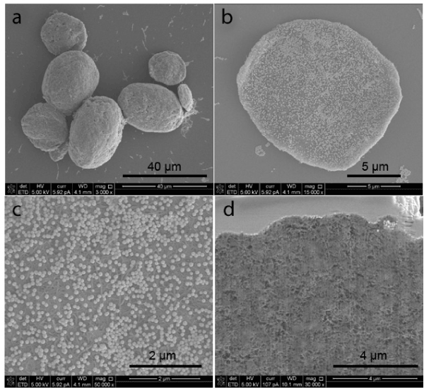Figure 4. (a) ~ (b) SEM images of CNMs conjugated with 100 nm NH2-decorated gold nanoparticles. (c) High magnification SEM image of the external surface of a CNM, demonstrating the presence of gold nanoparticles. (d) High magnification cross-sectional images of a CNM after focused ion beam ablation of a portion of the CNM.