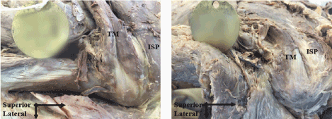 The cadavers were placed in a prone position where the skin and subcutaneous tissue of the back and shoulder were removed to expose the muscles arising from the posterior aspect of the scapula. The trapezius muscle was incised along the medial attachments to the spinous processes of the vertebral column and the superolateral attachments on the scapula and clavicle. The trapezius muscle was reflected superiorly to better expose the posterior aspect of the deltoid muscle and the rotator cuff muscles. The deltoid muscle was incised along the attachments to the clavicle, as well as the spine and acromion of the scapula. The deltoid muscle was reflected laterally to expose the head of the humerus, and the distal attachments of the rotator cuff muscles. The axillary nerve and accompanying posterior circumflex humeral vasculature along the deep surface of the deltoid was preserved. The fascia overlying the TM and infraspinatus muscles was removed with blunt dissection to clean the surface of the muscles in order to visualize the attachment of the TM. Because the TM is closely related to the infraspinatus, care was taken to identify the TM by the insertion and innervation. Probe dissection was used to further separate the TM from the infraspinatus muscle.