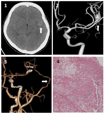 A 33-year-old female was found unconsciousness and sent to our hospital. Initial computed tomography CT) scan revealed diffuse SAH (Figure 1A). Further angiography demonstrated a 1.2 cm fusiform aneurysm with irregularity of distal left MCA (Figure 1B). Tracing the past history of this patient, there was no evident risk factors associated with such an aneurysm formation. Between clipping reconstruction and trapping with cerebral revascularization, we chose the latter due to complex aneurysm morphology and unclear etiology of aneurysm formation. We performed a standard pterional approach, a fusiform aneurysm located at upper trunk of MCA was found. As torturousity and irregularity of the aneurysm made direct aneurysm clipping difficult and unsecure, a left superficial temporal artery to MCA bypass and trapping of lesioned parent artery were done to secure the ruptured fusiform aneurysm and preserve distal left MCA perfusion. The patient got uneventful recovery after surgical procedures. Postoperative CT angiography revealed patent anastomosis with preserved perfusion in the MCA territory (Figure 1C). The aneurysm wall was taken for pathological examination.