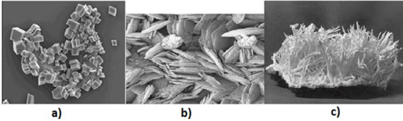 Figure 1. Type of crystals of various calcium carbonates: a) calcite; b) vaterite; c) aragonite