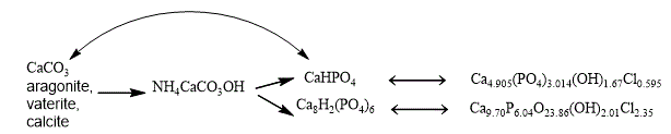 3CaHPO4+2 CaCO3+2 NH4Cl+2NH3+3 H2O + CO2 ⇄ Ca5(PO4)2(OH)2Cl2 + 3 NH4HCO3 + NH4H2PO4 (4)