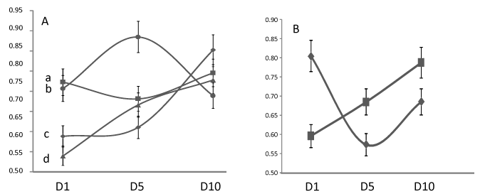 Figure 3. Influence of aneurysm location (A) or vasospasm (B) on the reactive oxygen species (ROS) detected after a calibrated photoreaction as compared to healthy controls (score 1) in 49 patients with subarachnoid hemorrhage at day 1 (D1), day 5 (D5) or day 10 (D10): a: anterior communicating artery (ACOA), b: Posterior locations, c: Middle cerebral artery (MCA), d: Anterior cerebral artery: (ACA). Evolution of ROS detection as compared to controls in patients without a vasospasm (N = 28, ▀) or diagnosed with a vasospasm (N = 21).