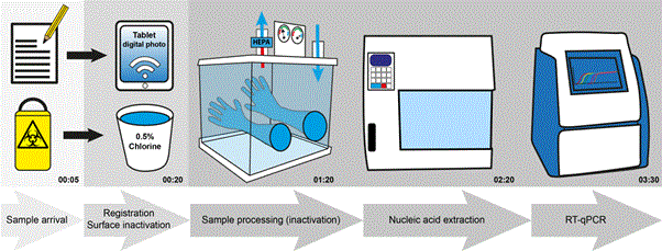 Figure 2. Schematic presentation of sample workflow and time-line of Dutch Mobile laboratories in West Africa, 2015 for ~ 10 samples. Step 1: Sample arrival: check biosafe containment and administration (5 min.). Step 2: Clinical forms photocopied for further administration and decontamination with 0.5% hypochlorite (15 min.). Step 3: Decontamination inner package in 1% hypochlorite, inactivation sample for EBOV testing, and Malaria testing (if whole blood) in Biosafety level 3 cabinet (75 min.). Decontamination sample tubes for EBOV testing for export out of Biosafety cabinet. Step 4: Automated nucleic acid extraction (60 min. including set-up of the machine). Step 5: Ebola virus real-time RT-PCR (70 min). Step 6: Interpretation PCR data including Quality Assurance check, administration and result reporting to responsible clinician (not shown, 30 min.).