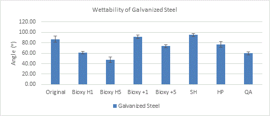 There seems to be a wider range for the surfaces of galvanized steel in terms of wettability. Bioxy +1 and sodium hypochlorite are the only ones that are slightly hydrophobic (91.3° and 95.1°, respectively). The t-test showed that only Bioxy H5 was significantly lower than the other surfaces, making it the most hydrophilic.