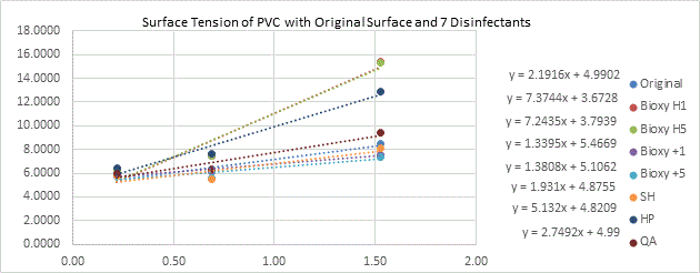 Figure 4b. Surface tension of PVC with original surface and with the addition of the seven disinfectants. 3 readings of each sample (n=3) was taken with water, formamide and diiodomethane.
