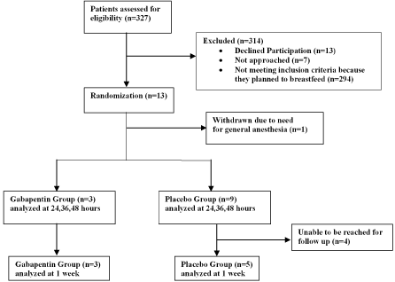 From October 2015-January 2017, 327 women were screened, 33 were found eligible for the study, and 13 women were consented and randomized as follows: 3 to gabapentin, 10 to placebo (Figure 1). One woman in the placebo group was withdrawn after having to be converted to general anesthesia during her cesarean. Complete follow up data were unable to be obtained on 6 participants because they were unavailable for contact one week after cesarean delivery. All 6 were randomized to the placebo group. However, in-hospital data were collected on all subjects.