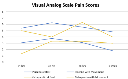 Conclusion: In this small pilot study, the use of gabapentin in the acute postoperative period following a cesarean delivery appears to reduce opiate consumption without significantly altering VAS pain scores or incidence of adverse side effects.
