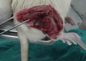 On the seventh day, the animals were anesthetized for surgical resection of the skin and subcutaneous tissue of the back (Figure 5) with an electric scalpel (to avoid leakage from the blood vessels). After removal of the material for examination, the animal was euthanized with anesthetic overdose.