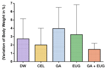 All the animals were weighed on the first and last day of the experiment to calculate the weight variation in percent (Figure 8). The relative body weight variation (ΔP%), also expressed in percent, was determined in the animals of the distilled water (DW), celecoxib (CEL), gum arabic (GA), eugenol (EUG) and gum arabic plus eugenol (GA+EUG) groups, calculated according to the expression: ΔW%=[(WD1–WD6)/WD1].100, where WD1 and WD7 denote the body weight measured on the first and seventh days, respectively. Data are expressed as mean and standard deviation of the measurements. Comparisons among the five groups were carried out by one-way analysis of variance (ANOVA) complemented by the Tukey multiple comparison test between the paired groups. There were no statistically significant differences of the DW, CEL, GA, EUG and DW+EUG groups regarding relative variation of body weight (ANOVA: F= 0.8531; P= 0.5071).