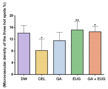 Table 1. Relative variation of body weight, tumor volume and microvascular density measured in the animals of the distilled water (DW), celecoxib (CEL), gum arabic (GA), eugenol (EUG) and gum arabic plus eugenol (GA+EUG) groups. Comparisons of the five groups were performed by one-way analysis of variance (ANOVA) complemented with the Tukey multiple comparison test, to verify pairwise difference between the groups