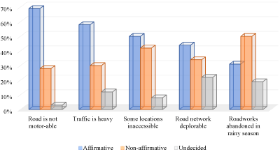 From the responses of the respondents, 43% of the respondents strongly agreed that at current state, there is no smooth motor able road (P < 0.001). It can be said that there are no smooth motor able roads in the study area. Then for traffic congestions, strongly agreed and agreed happens to have the highest chi-square residuals. This implies that there are heavy traffic congestions on the road network (p< 0.003). For the accessibility of certain locations, the responses are mix, as 49% of the respondents agreed that certain locations are accessible while 42% disagreed and remaining other being unsure (Figure 1). The same but varying proportions of mixed responses were observed in other investigated themes (Table 2). Critical review of the results on Table 2 show that on average, there level of perception regarding assessed themes are