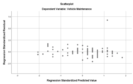 From the analysis, a little homoscedasticity of responses as regard the model is observed (Figure 2). The correlation coefficient between PNR and vehicle maintenance was positive (R=0.576); and coefficient of determination that measures covariance between PNR and vehicle maintenance is ‘R2=0.332’ (p<0.001). Based on this, the null hypothesis is rejected, and alternate hypothesis accepted – i.e., PNR has significant positive effect on vehicle maintenance. The result of the regression analysis revealed that poor road network has a significant impact on vehicle maintenance. This implies the rate of damage it does to vehicle has eventually increased the rate at which vehicle owners take their vehicles for maintenance. In light of this, an increase in poor road networks will eventually increase the frequency of one taking its vehicle for maintenance.