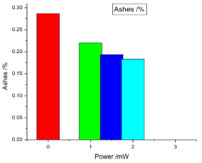 Figure 5. illustrates the variation of the ashes of honey samples versus laser output power; it shows that the ashes of the reference sample was 0.28666%, while the irradiated samples ashes decrease proportional to the laser output power, the irradiated samples ashes percentages were 0.22%, 0.1933333% and 0.18333%.
