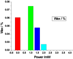 Figure 7. illustrates the variation of the wax of honey samples versus laser output power; it shows that the wax of the reference sample was 0.060666%, while the irradiated samples wax increased by the low power greater than the control wax, but it was decreased proportional to the laser output power, the irradiated samples wax percentages were 0.0746666%, 0.048% and 0.027333%.