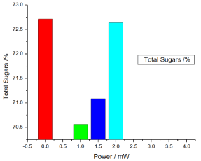 Figure 8. illustrates the variation of the total sugar of honey samples versus laser output power; it shows that the reference sample total sugar was 72.713333% and the irradiated samples total sugar percentages were 70.56%, 71.0833% and 72.63666%, there was no significant differences (P>0.05) in the irradiated samples total sugar compare with the reference sample.