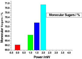 Monocular sugars also increased proportional to the laser output power; this may be due to the degradation of the total sugar by laser pulses. The monocular sugar contents of the samples used in this study had average value of 70.0016655 ± 0.9516645, the values obtained in this study are similar to the values reported for honeys from Bangladesh [12].