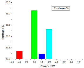 Figure 11. illustrates the variation of the fructose of honey samples versus laser output power; it shows that the reference sample fructose was 37.35% and the irradiated samples fructose percentages were 39.143333%, 37.21333% and 38.316666%, there was no significant differences (P>0.05) in the irradiated samples fructose compared to the reference sample.