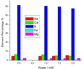 Figure 15. illustrates the amount of sodium (Na) in the different samples; it shows that the amount of sodium in the reference sample was 4.593333%, while in the irradiated samples sodium slightly increased proportional to the laser output power in the range from 4.48% to 5.43%.
