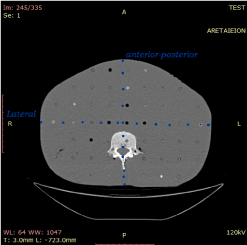 Figure 2. The documented dimensions from a CT scan, needed to calculate the Effective Diameter (Eff-D) of each patient. Rando Phantom transverse slice is displayed to show the AP and LAT measurements