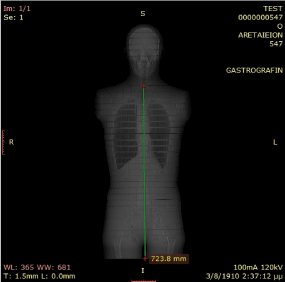 For these reasons the head and legs parts were omitted from calculations and only the body part (trunk) was examined. This was done by calculating the percentage of the total scan length occupied by the trunk. It was found to have an average value of 47.9%. By multiplying this percentage to the DLP value, the body DLP was extracted. DLP values for the trunk varied between 240 - 340 mGy *cm and effective diameters between 20 – 36 cm. The part examined can be seen on a scanogram in figure 3.