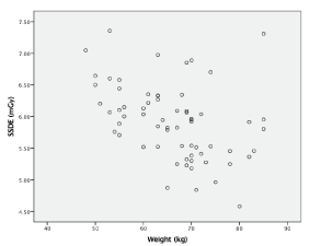 Figure 4. Linear regression between the SSDEs and the corresponding patient body weights. A moderate negative linear correlation is shown (r = - 0.41; P < 0.001)