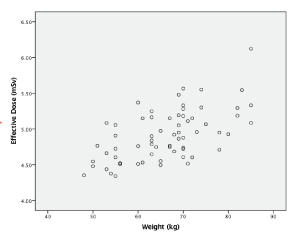 EDs do not take into account patient body size; however, a linear regression test between EDs and patient body weights presents a moderate positive correlation between the two (Pearson correlation, r = 0.59; P < 0.001). The pattern can be seen in the scatter plot of the two data sets (Figure 5).