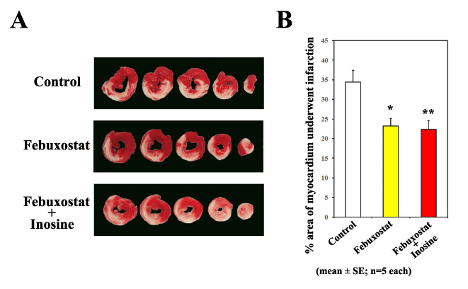 B) The infarct size in the febuxostat-treated group and the (febuxostat plus inosine)-treated groups were significantly smaller than that in the control group (n=5 each, *P<0.0174 and **P<0.0109, respectively), however, there was no significant difference between the febuxostat-treated group and the (febuxostat plus inosine)-treated groups (P=0.963; Tukey-Kramer method).