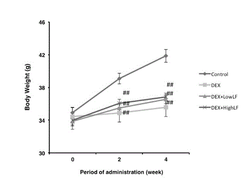Lines indicate the time course of weight changes in mice after 4 weeks of LF injections. Mice were treated with DEX (0.5 mg/kg/day, n = 12), DEX and LF at 30 mg/kg/day (LF30, n = 12), DEX and LF at 300 mg/kg/day (LF300, n = 12) or vehicle (n = 12). ##: p < 0.01 significantly different from the control group.