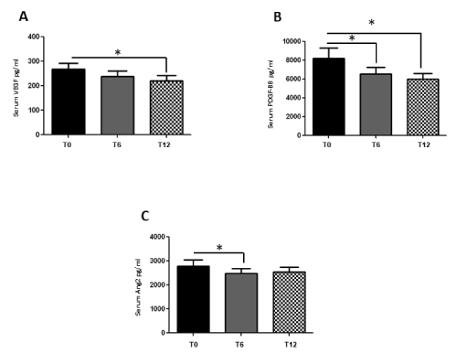 Figure 1. Effects of one-year anti-TNF therapy on serum levels of VEGF (1A), PDGF-BB (1B) and Ang2 (1C). Measurements were performed at baseline (T0), after 6 8T6) and 12 months 8T12) of treatment. Asterisks indicate significant changes (p<0.05)
