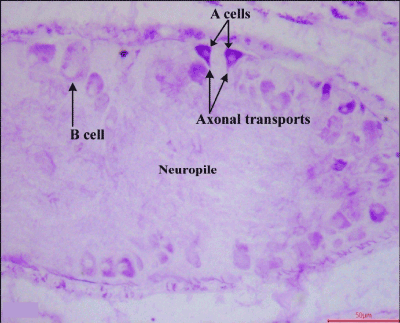 Frontal sections of cerebral ganglia of control earthworms had thick cortical tier of neurosecretory cells of two categories, deep stained A cells and lightly or moderately stained B cells (Figure 2a and b). Small A cells occupied the outer cortical tier and had colloidal secretion (neurosecretory materials) and large B cells lie in between A cells (Figure 2a) and inner fibrous neuropile (medulla). In fact, fibrous neuropile is made up of axons emerging from neurosecretory cells as well as ordinary neurons. Neuropile is distributed with blood capillaries (Figure 2b). Both A and B neurosecretory cells displayed distinct cycle of secretion in the cerebral ganglia of control earthworms. Peripheral margin of neuropile with accumulation of neurosecretion through axonal transport is considered as “zone of accumulation” (Figure 2a). The perineurium (outer neural sheath of cerebral ganglia) showed scanty distribution of neurosecretory material.
