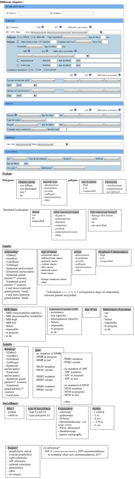 Different key points have been targeted and validated by the MDC as decisive indicators for a decision-making: 1) the nature of tumours of a suspected predisposition, 2) the age of diagnosis, 3) the degree of relationship of relatives with the proband, 4) the availability of somatic tests (RER and IHC) and genetic testing, and 5) the care-management recommended for a patient and his or her family. Taking into account these elements, an electronic tool was developed by a clinical informaticist affiliated with the Lyon region’s cancer genetic network and was used to gather and analyse the major criteria of a patient’s given decision-making process. It is integrated into the electronic medical record system (Easily software).