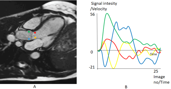 Figure 3. A. Blood velocity graph in the heart ventricle and aorta. (MRI. TrueFisp. Mean curve). Red and yellow points – opposite walls of the left ventricular outflow tract, green and blue - in the sinotubular junction.