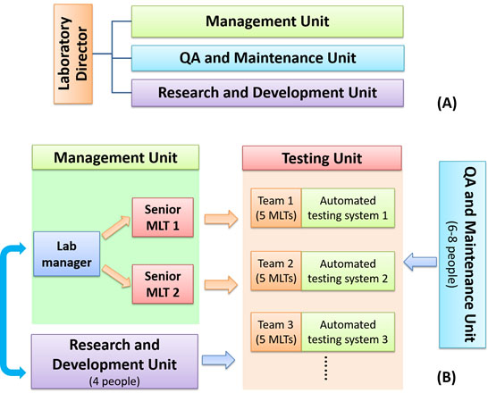 Figure 4. Proposed management scheme for an automated medical laboratory. A) Structure of laboratory management committee. The committee should include one laboratory director, one representative from management unit, research and development unit and, quality assurance (QA) and maintenance unit respectively. B) Infra-structure of medical laboratory: there are five key units in the laboratory system including management unit with laboratory manager and senior medical technologists (MLTs), testing unit with MLTs and automated systems, QA and maintenance unit and research and development unit.
