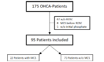 Methods: During 2016 and 2017 all adult patients admitted to our university hospital after OHCA, were included in our retrospective data analysis. As primary outcome, we compared survival to discharge grouped by first serum phosphate levels after arrival (cutoffs: ³2.5 and ³3 mmol/l) with and without following implantation of MCS.
