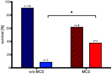Patients (with and w/o MCS) who survived until discharge had significantly lower initial serum phosphate (2 ± 0.18 vs. 2.9 ±0.14 mmol) and lactate (5.5 ± 0.87 vs. 10.2 ± 0.78 mmol/l) than those who died. Chance of survival (overall groups) did not differ in dependence of MCS (36.25 vs. 36.99 %).