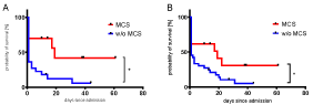 Figure 3. Kaplan-Meier-curve of patients with initial serum phosphate ≥ 3.0 mmol/l (A) or ≥ 2.5 mmol/l (B) and MCS (red) had a higher chance of survival than those without (blue). A: n=32, p< 0.01 with Log-rank (Mantel-cox) test. B: n=45, p= 0.03 with Log-rank (Mantel-cox) test. MCS: mechanical circulatory support; w/o: without