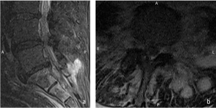 Figure 1: Sagittal (a) STIR-image (short-tau-inversion-recovery) shows edema in the sacrum as well as fluid collections in the Back musculature. Transversal T2-image (b) shows left-sided fluid collections in the back musculature and psoas muscle.