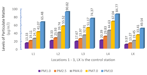 High level of particulate matter exceeding regulatory limits of the World Health Organisation (90 µg/m3) have been previously reported across major cities in Nigeria. For instance, the value of PM10 and Total Suspended Particulate (TSP), ranging from 118.3-132.0 and 1033 to 40000 µg/m3 have been reported [14]. As reported by several authors, health cases linked to exposure of particulate matter includes but not limited to; untimely death of persons who present cases of heart or lung infection, intensified asthma, heart attacks, asymmetrical heartbeat, deteriorated lung function, and amplified respiratory symptoms which includes; coughing, irritation of the airways, or difficulty breathing.