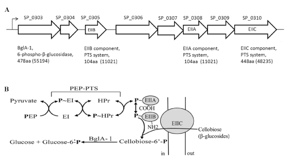 Figure 1A. genetic organization of the β-glucoside operon in S. pneumonia TIGR4. SP numbers represent the order of gene loci. Values in parentheses are calculated molecular weights of encoded proteins