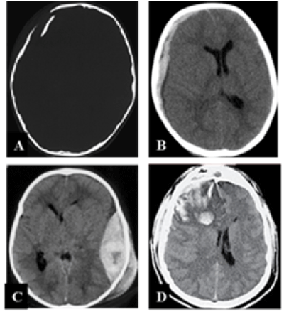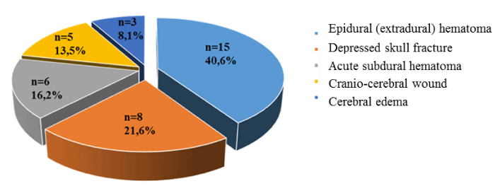 At cerebral CT-scan, extra-dural hematoma (Image1-C) was the most seen followed by depressed skull fractures (Image1-A), onset acute subdural hematoma (Image 1-B) and finally intracranial hypertension caused by cerebral oedema (Image1-D) with respectively 21.6%, 16.3%, 13.5% and 8.1%. 40.5% of children was suffering of associated injuries; they was distributed between maxillofacial injuries (16.2%) and limbs trauma (24.3%). In this latter group it’s noted lower limb fractures (66.7%) and 3 cases of upper limb fractures (33%).